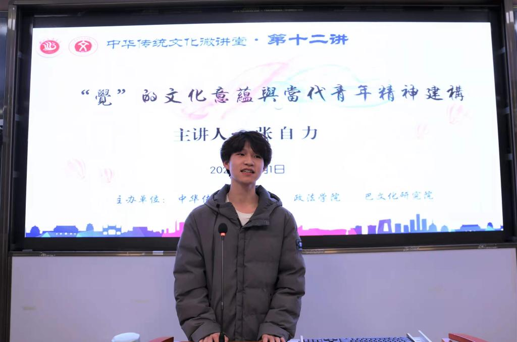 12月1日晚,一场题为《“觉”的文化意蕴与当代青年精神构建》的文化讲座正在博文楼313沉浸式教室进行。我院历史学大二学生张自力受邀担任本次主讲嘉宾。