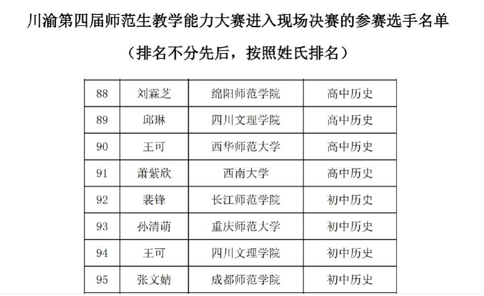 10月13日,川渝第四届师范生教学能力大赛决赛名单公示。经专家评审,共有160人从来自29所高校的537 名初赛选手中脱颖而出,入围决赛。其中,7所高校的8名选手入围历史学科组决赛。我院历史学专业学生邱琳、王可双双入围决赛,在历史学科决赛选手中“独占两席”,取得历史性优异成绩。11月中下旬,她们将在长江师范学院举行的线下决赛中携手向一等奖发起冲击。