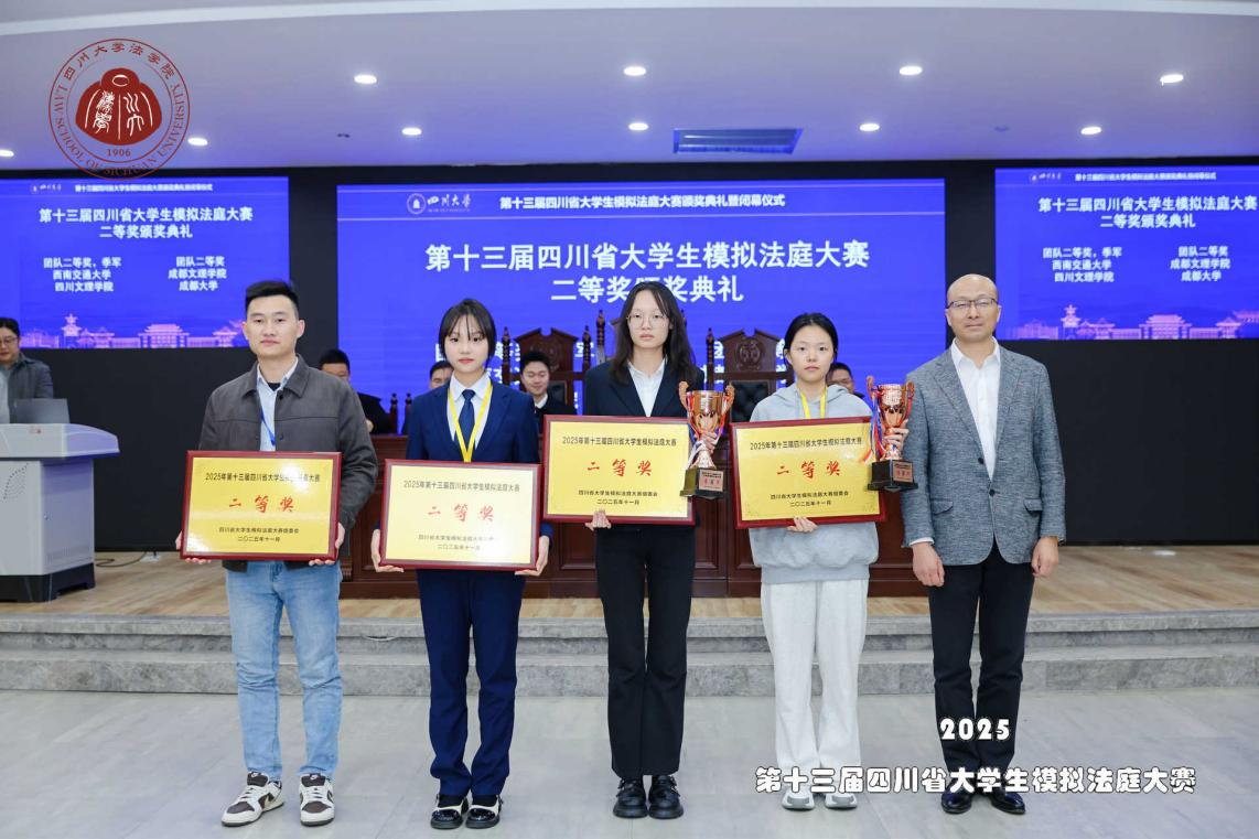 11月22至11月23日,2025年第十三届四川省大学生模拟法庭大赛在四川大学圆满落幕。四川省大学生模拟法庭竞赛是省内法学教育界最具影响力和权威性的赛事之一,旨在通过模拟真实法庭审判,全面考察学生的法律专业能力、逻辑思辨能力、语言表达能力和临场应变能力。本届模拟法庭大赛吸引了包括四川大学、西南财经大学、西南交通大学在内的全省25所高校的优秀法科学子同台竞技。我院知识产权专业代表队凭借出色的专业素养与卓越的庭辩风采,在激烈的角逐中力挫群雄,最终荣获大赛二等奖(季军)。这一辉煌战绩不仅刷新了我院在该项赛事中的历史记录,更标志着我院在培养高素质法律专业人才的道路上实现了里程碑式的重大突破。