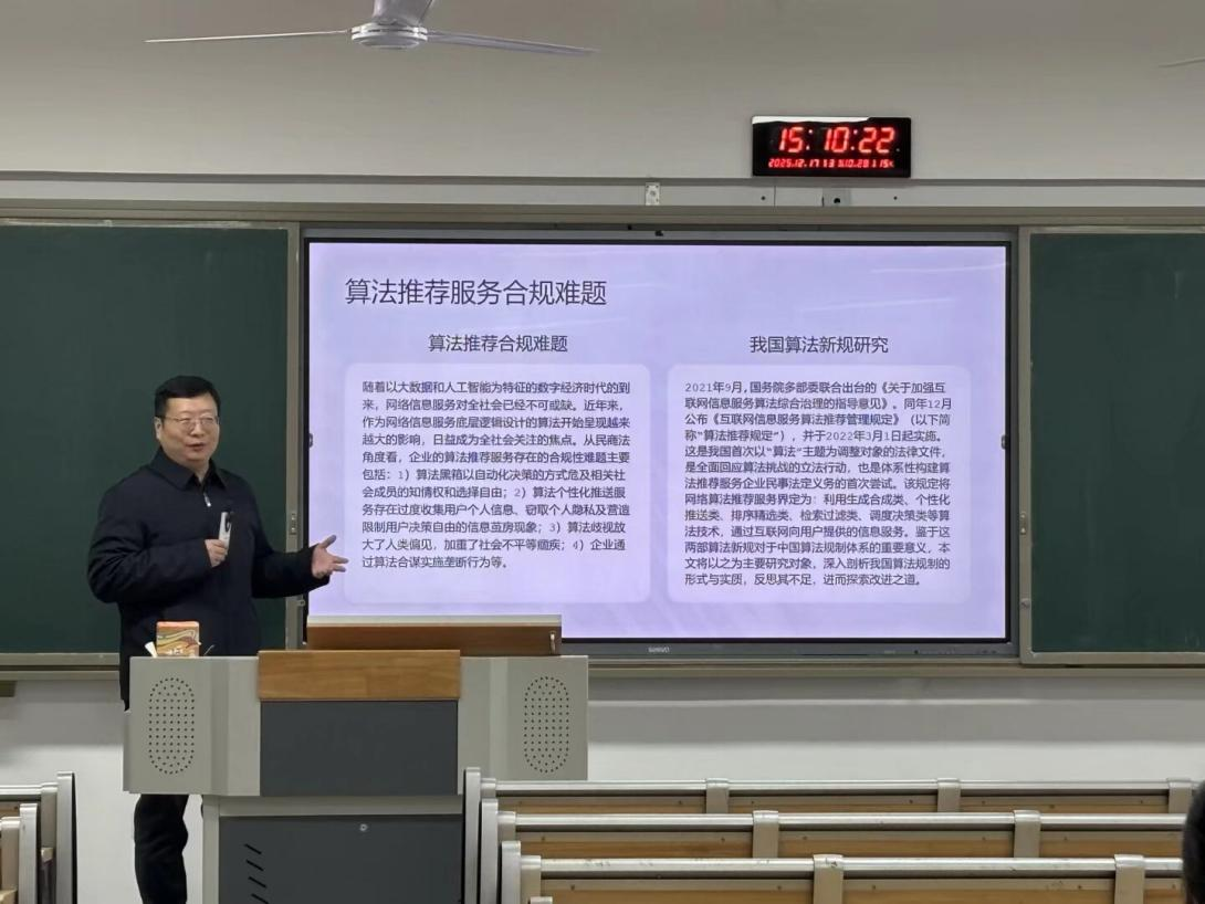 讲座伊始,秦立崴教授以我国算法治理立法进程为切入点,系统梳理《民法典》《互联网信息服务算法推荐管理规定》等法律法规中关于算法推荐服务提供者义务的核心条款,清晰勾勒出我国算法推荐服务民事法定义务体系的立法框架。他指出,随着算法技术在电商、社交、资讯等领域的深度应用,算法黑箱、个性化推送侵权、算法歧视等问题频发,明确算法提供者的民事法定义务,是平衡技术创新与用户权益保护、推动算法向善发展的关键抓手。