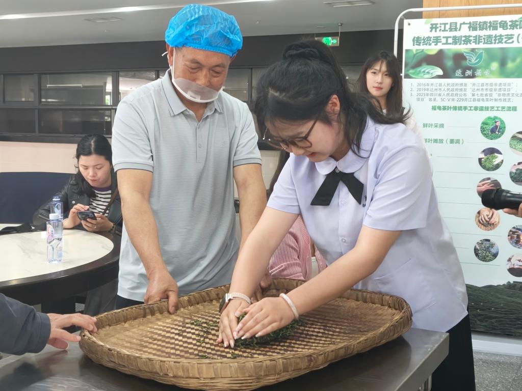 活动伊始,丁昭亮老师在同学们期待的目光中,现场展示了传承百年的川东手工制茶技艺。伴随着铁锅中“噼啪”作响的声音,青翠的茶叶在高温下翻滚,散发出沁人心脾的清香。